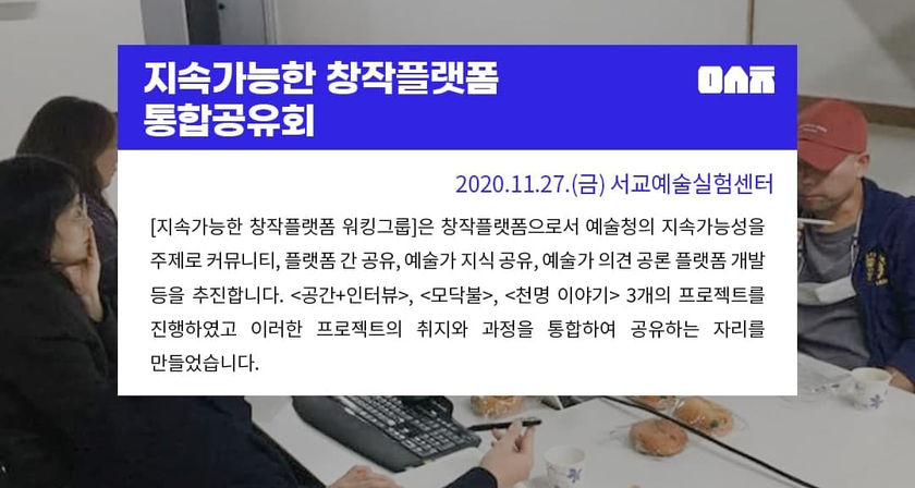 지속가능한 창작플랫폼 워킹그룹은 창작플랫폼으로서 예술청의 지속가능성을 주제로 커뮤니티, 플랫폼 간 공유, 예술가 지식 공유, 예술가 의견 공론 플랫폼 개발 등을 추진합니다. 지속가능한 창작플랫폼은 11개월간(2020년 1월~11월) 약 15명의 예술가들과 기획자. 재단관계자들이 모여 예술가와 향유자에게 필요한 지속가능한 창작플랫폼을 위해 기존의 창작공간, 온라인플랫폼을 분석 하고 보완점을 찾아 실험하고 탐구하였습니다. 그 내용을 바탕으로 이를 현실화하기 위한 플랫폼의 정체성을 수립하는 과정에서 다시 세 개의 프로젝트(공간+인터뷰, 모닥불, 천명의 이야기)로 나누어졌습니다.